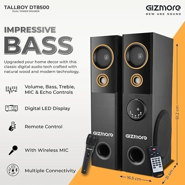 - WOOD! IT IS THE SECRET TO GREAT SOUND. The New DT8500 Dual Towers from Gizmore have a real wood construction to make music like you have never heard before. Check them out and you’ll touch wood, packing a powerful bass and a range of connectives in an elegant wooden cabinet; Electro sac tower speakers look and sound just wonderful. Sing along with the convenience of a microphone.