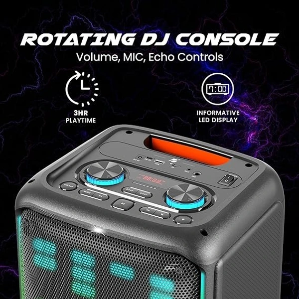 | Special Features | Playtime of Up to 3 hours, TWS Function, Multi-Connectivity (Bluetooth, FM, AUX, USB, TF Card), UHF-DSP Wireless MIC (30-meter Range), Portable and Powerful, Guitar Connectivity, 160 W High-Definition Sound, Dual Charging, Digital LED Display with DJ Console & Remote Control, 20.32cm (8inch) Dual Big Woofer, Voice Changing Function |