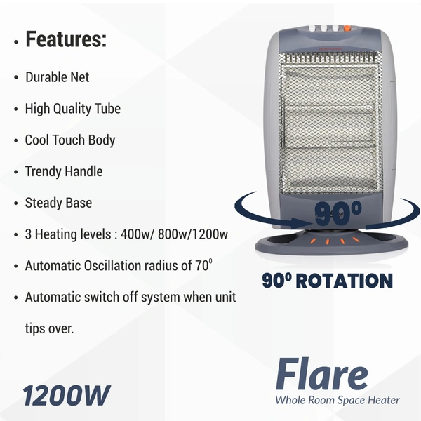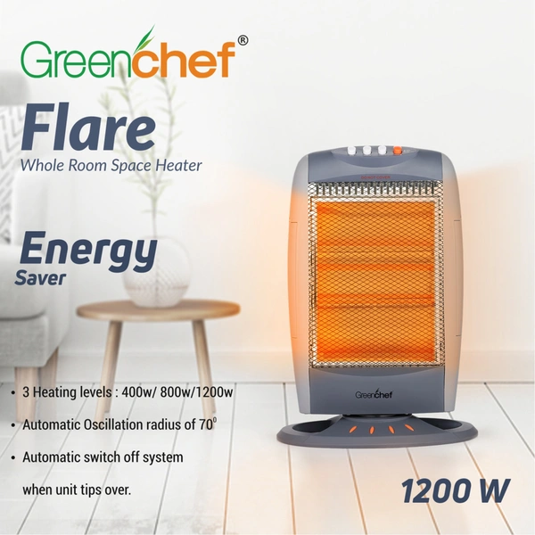 Greenchef Flare Halogen Heater 1200-Watt with Overheating Protection use the latest in light technology for power savings by using a combination of Extra-long Heating Halogen tubes along with High-grade Reflectors for an uninterrupted and efficient heating experience. They also come equipped with Wide Angle Oscillation function to ensure even heating across the room.