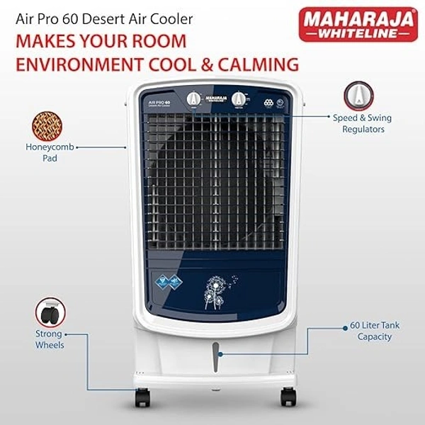 Soothing you for a relaxed good night’s sleep, Maharaja Whiteline Air Pro 60 Air Cooler is designed to make your breathing space easier and extra comfortable. Powered with high air delivery of 5300 CMH and a strong air throw of 1372 cm, the Air Cooler can hold up to a total tank capacity of 60 liters. Giving you instant as well as long-lasting cooling, Air Pro 60 is sure to be a reliable choice.