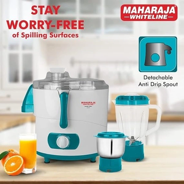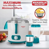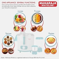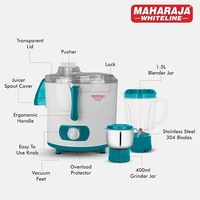 With its powerful 450-watt motor, the Maharaja Whiteline Mark Deo Juicer Mixer Grinder provides an excellent grinding, blending, and juicing experience. 30 Minutes of continuous usage: With a perspicacious design and high juicing efficiency, this product offers a non-stop and hassle-free usage of 30 minutes, adding efficiency to your cooking. Dual side locking system: Along with its prepossessing look & impressive performance, this appliance has a dual side locking system which further adds to its safety. It allows you to lock your ingredients out and out ensuring no spill & splatter. Stainless steel blades to mix and grind: The Juicer Mixer Grinder features top-notch and perfectly sharp blades made of sturdy stainless steel material. Be it plushy fruits or tough spices, Mark Deo juices, mix and grinds them all! Stainless Steel Cutter & Juicer Mesh: The results of Mark Deo Juicer Mixer Grinder never cease to amaze you. It is devised to perfection with premium body parts like stainless steel juicer mesh, cutter, and a detachable anti-drip spout. With 2 multi-utility jars: This Juicer Mixer Grinder comes with a set of two jars including a blender jar of 1.5 liters and a grinder jar of 700ml adding versatility to your kitchen tasks. Overload Protector: Installed with an overload protector, Mark Deo monitors the current in the motor circuit to prevent motor damage and adds safety and longevity to its utility. 2 years of warranty: Along with top-notch performance and fine results, the Mark Deo Juicer Mixer Grinder offers an assurance of long usage with a 2-year warranty on the appliance.