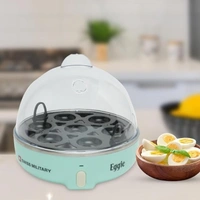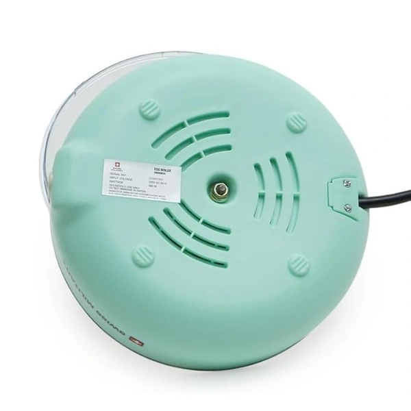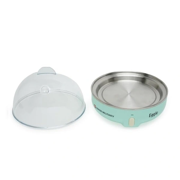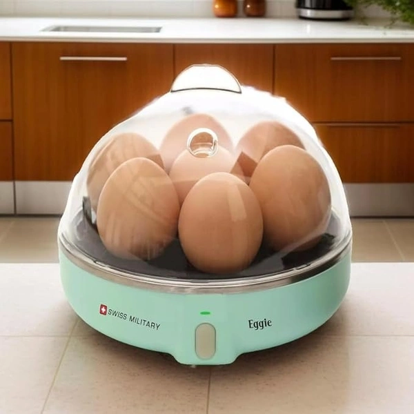 The Swiss Military Eggie Green Electric Egg Boiler simplifies your morning routine, ensuring perfectly boiled eggs every time. Durable Stainless Steel Heating Plate: Equipped with a robust stainless steel heating plate, this appliance provides even cooking for consistently excellent results. ? Monitoring Made Easy: The built-in cooking and signal indicator lights keep you informed throughout the egg-boiling process, so you can achieve your preferred level of doneness. ? Transparent Viewing: The transparent plastic top allows you to watch the eggs as they cook, ensuring you have full control over your breakfast. ? Versatile and Powerful: With the capability to boil up to 7 eggs at once, 350 watts of power, and a user-friendly push button switch, this egg boiler offers both convenience and efficiency for your morning meal.