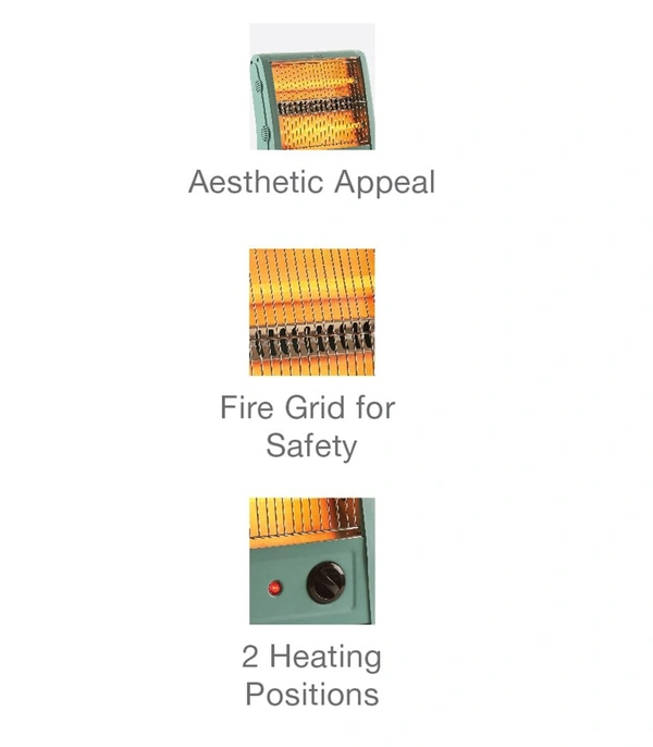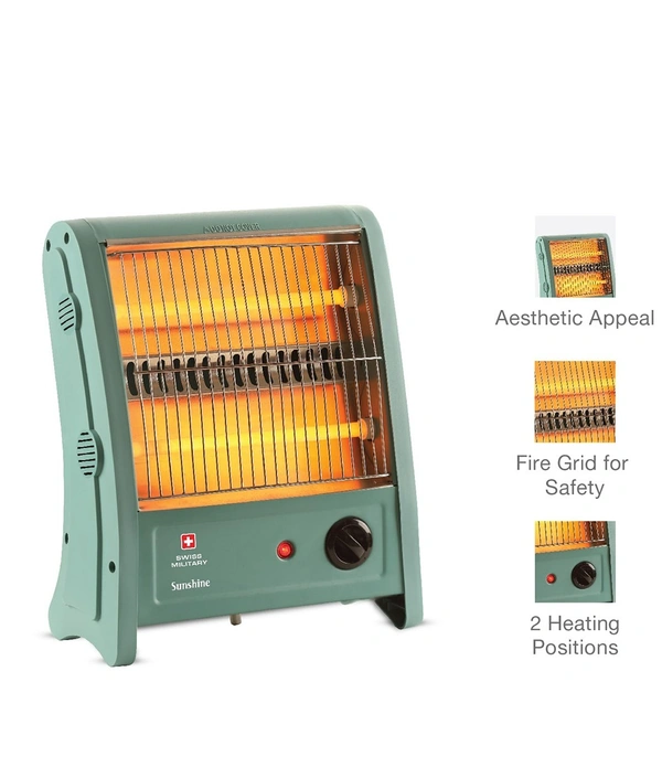 Two quartz tube heating elements, Low Power consumption, Front grill for safety, Safety Tip over protection, we took the classic rod heater, used the latest in light technology to upgrade the elements, made them efficient and power saving and finally made the unit much safer to use, to create the Swiss Military Sunshine Quartz Heater.
