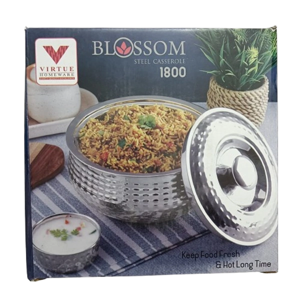 Upgrade your dining experience with the Blossom Steel Casserole 1800 ml by Virtue Homeware. Designed with premium stainless-steel insulation, this casserole keeps your food fresh and hot for hours while adding a touch of elegance to your kitchen.